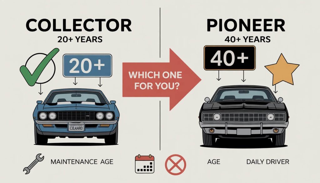 - Vehicle age (20+ years for Collector, 40+ for Pioneer)